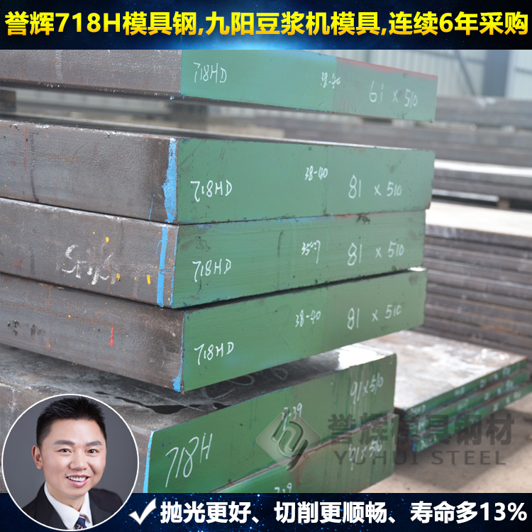 譽輝718H,模具鋼硬度HRC36°以上,模具壽命多13%。譽輝718H模具鋼,九陽豆漿機連續6年采購。6個塑膠廠長期采購,8年無客戶退貨。