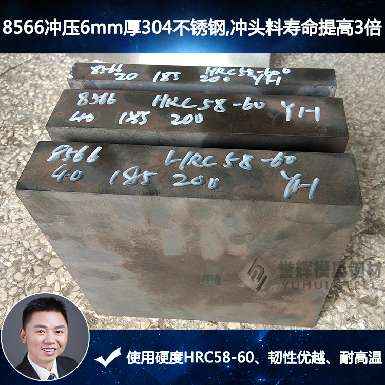 經(jīng)驗中,常規(guī)牌號的模具鋼,沖壓4mm厚的201不銹鋼,會遇到?jīng)_頭料很快崩裂,模具不耐用。而用譽(yù)輝專有成分的8566模具鋼,基本不會崩裂或斷裂,沖頭使用壽命成倍增加。