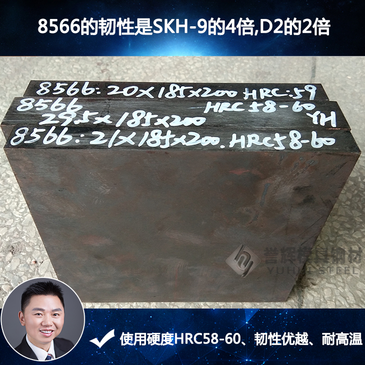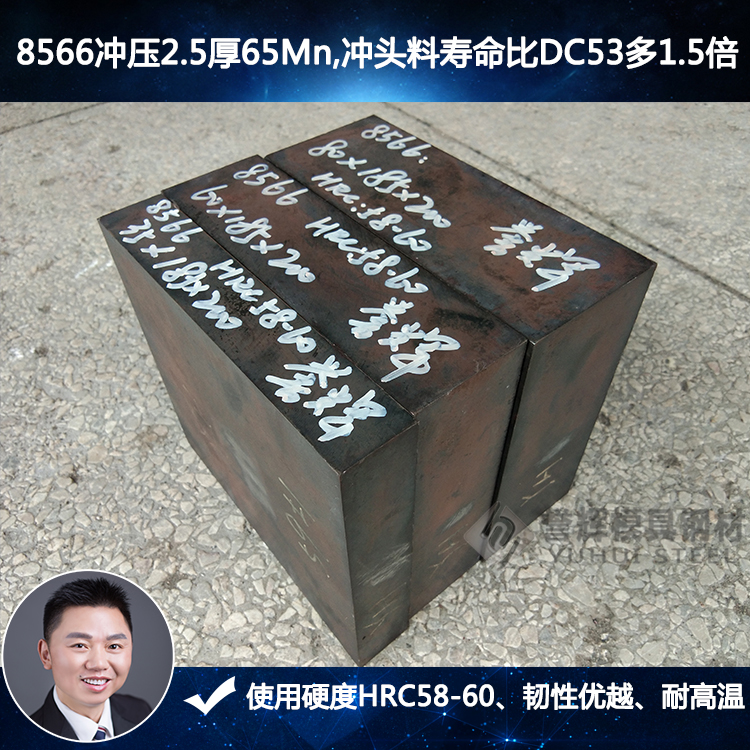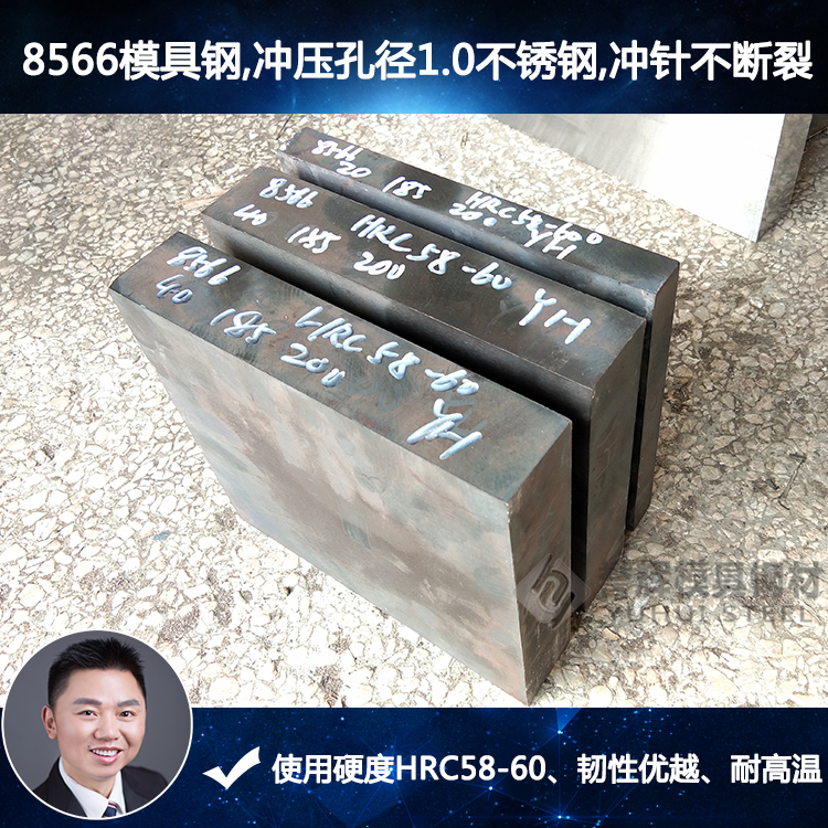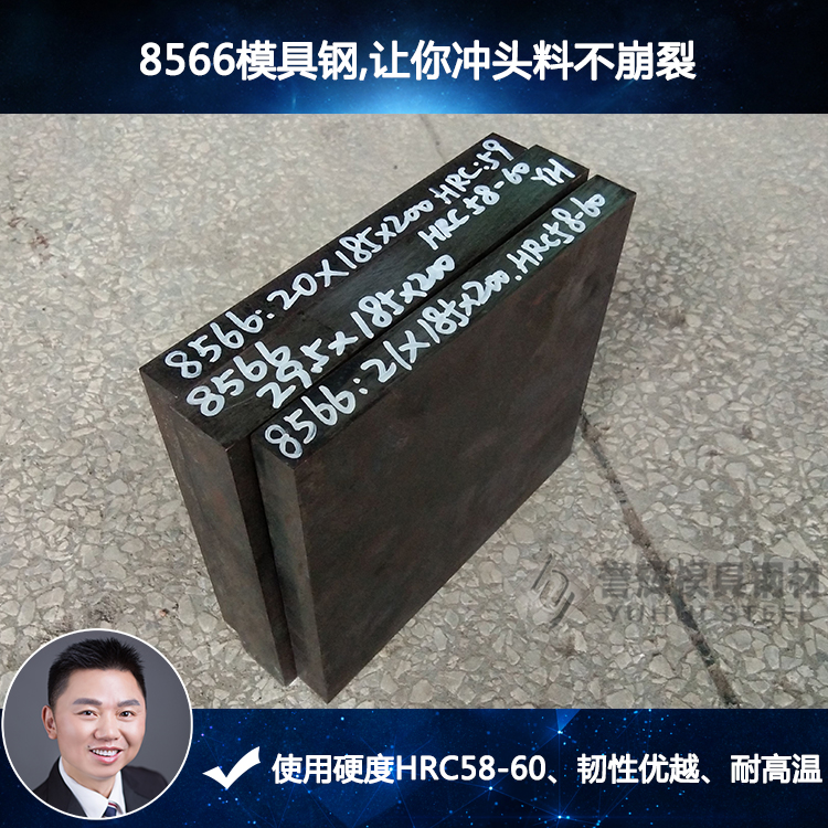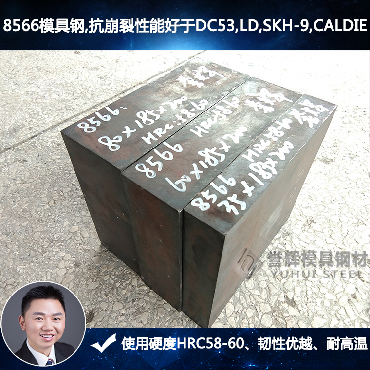 8566模具鋼的韌性,是高速鋼SKH-9的4倍,D2的2倍。抗崩裂性能比DC53,D2,LD,SKH-9,CALDIE還要好。沖頭料用8566模具鋼,不用擔(dān)心崩裂問題。8566的使用硬度在HRC55-60之間,高硬度代表高強(qiáng)度和高耐磨性。8566把耐磨性和韌性平衡的非常好,既有一定的耐磨性,又有韌性,可以保證模具壽命超過常規(guī),同時確保沖頭料不崩裂。