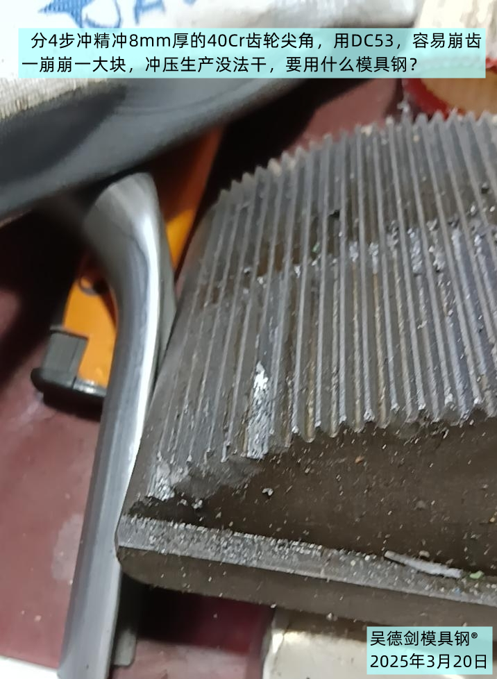 今天收到一個咨詢,我挺唏噓的。譚先生說,他精沖8mm的40Cr材質的齒輪尖角,現在模具是分四步精沖的,用Cr12MoV的時候,壓一個產品就爆裂了,現在用DC53,一崩崩一大塊,問精沖模具要用什么模具鋼?