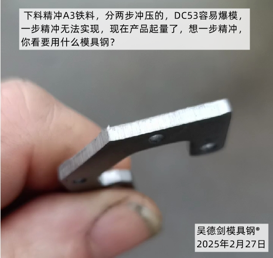 這讓我想起了前段時間來找我們的一位客戶,他是精沖A3鐵料的,模具用DC53的時候,一步精沖的時候要爆裂,模具干不了,間隙太小了,模具直接就壓爆掉了,現在是分開兩步下料精沖的,但是效率低下,而且產品報廢率高,因為工人稍微一下沒注意,產品沒放到位,壓出來的產品就報廢了,如果是產品或模具上面粘上一點點臟東西,你壓下去光亮帶也不好了,產品也是報廢了,現在效率太低,報廢率高,原來沒有什么產量還沒所謂,現在產品起量了,我要買8566模具鋼來做,一步精沖。