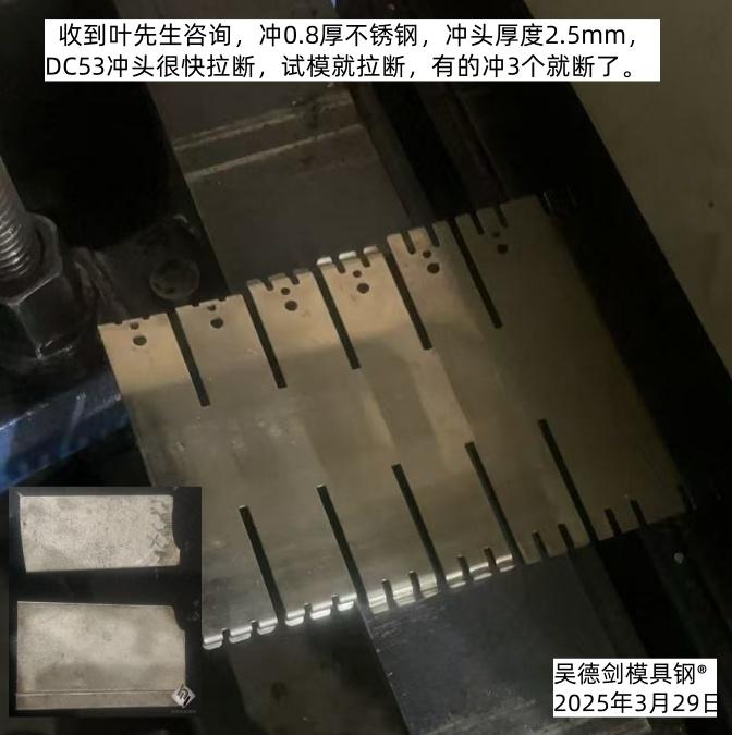收到葉先生咨詢,沖0.8厚不銹鋼,沖頭厚度2.5mm,DC53沖頭拉斷嚴重,試模就拉斷,有的沖3個就斷了,生產沒法干,請問沖頭要用什么模具鋼?