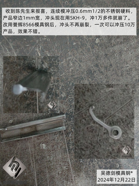 陳先生來報喜,連續模沖壓0.6mm1/2H的不銹鋼硬料,產品窄邊1mm寬,沖頭用SKH-9,沖1萬多件就崩了,但改用譽輝8566模具鋼后,沖頭不再崩裂,一次可以沖壓10萬產品,效果不錯,沖頭壽命提高了10倍。