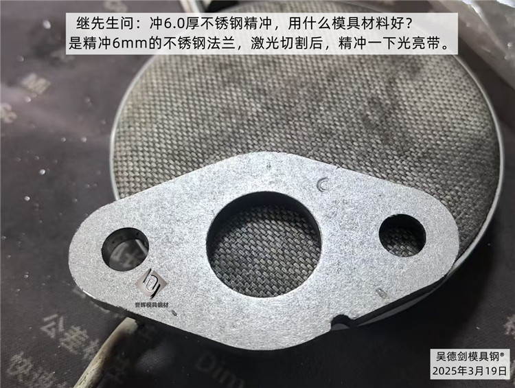 細聊后得知,是精沖6mm的不銹鋼法蘭產品,激光切割后精沖一下光亮帶?,F在的模具老是磨損,光亮帶有拉痕,達不到要求。