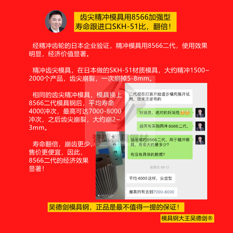 第二款是8566加強型,硬度HRC60-64,抗崩裂性能是SKH51高速鋼的2倍,既有高速鋼的硬度,又有模具鋼的抗崩裂性能,其它模具鋼做不到。既能保證不崩裂,還能保證光亮帶的沖切效果,耐磨性又好,壽命長,是精沖刮光亮帶的不二選擇。