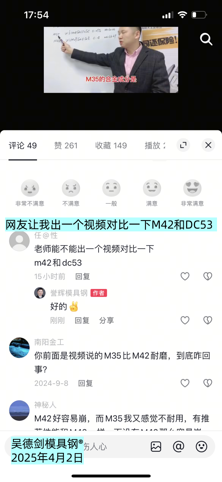 網友任性讓我對比一下M42和DC53。M42和DC53,雖然同屬于工具鋼,但卻是不同類別的材料,它們各自的性能和使用場合都不同,但它們又是冷作模具里面頻繁出現的兩款鋼種,它們的區別至少有9點。