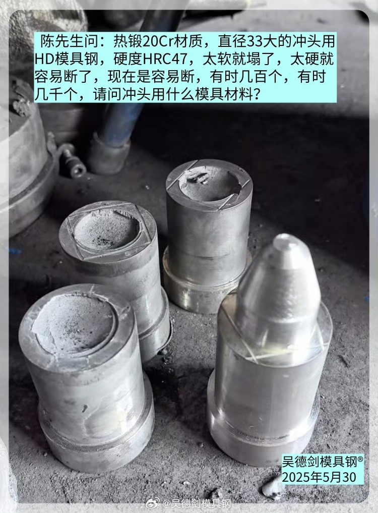 陳先生問:熱鍛20Cr材質,直徑33大的沖頭用HD模具鋼,硬度HRC47,太軟就塌了,太硬就容易斷了,現在是容易斷,有時幾百個,有時幾千個,請問沖頭用什么模具材料?