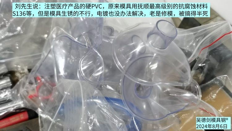 劉先生他是注塑醫(yī)療產(chǎn)品的硬PVC的料,他說原來模具,用撫順最高級別的一款抗腐蝕模具材料,還有S136等,但是模具生銹的不行,電鍍也沒辦法解決,老是修模,被搞得半死。他去年找到我的時候,基于他是注塑硬PVC腐蝕性極強的材料,現(xiàn)在用的模具鋼主要的問題也都是生銹,我就給他推薦了M316這款超級不銹鋼。
