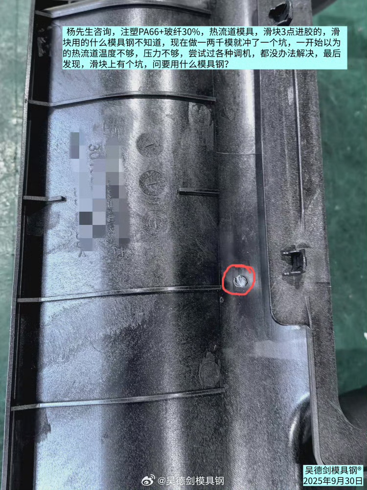 收到楊先生咨詢,注塑PA66+玻纖30%,熱流道模具,滑塊3點進膠的,滑塊用的什么模具鋼不知道,現在做一兩千模就沖了一個坑。一開始以為的熱流道溫度不夠,導致流動性不夠,又以為壓力不夠,嘗試過各種調機,都沒辦法解決,最后發現,滑塊上有個坑,問要用什么模具鋼?