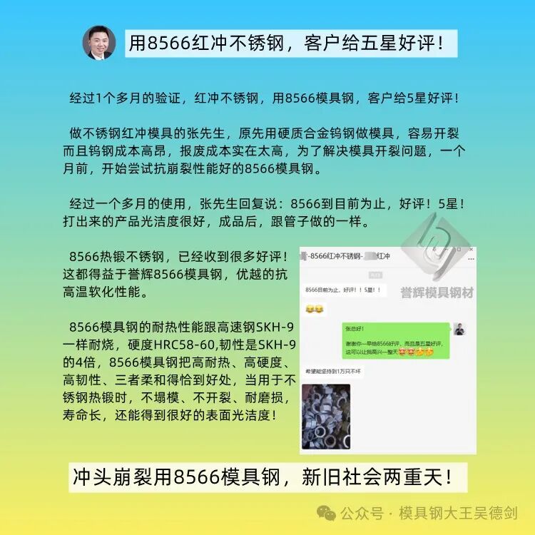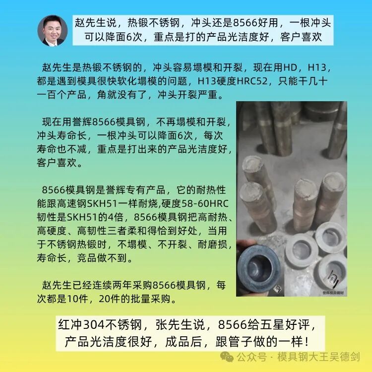 但后來(lái)用譽(yù)輝8566模具鋼,不再塌模和開(kāi)裂,沖頭壽命長(zhǎng),一根沖頭可以降面6次,每次壽命也不減,重點(diǎn)是打出來(lái)的產(chǎn)品光潔度好,客戶喜歡。