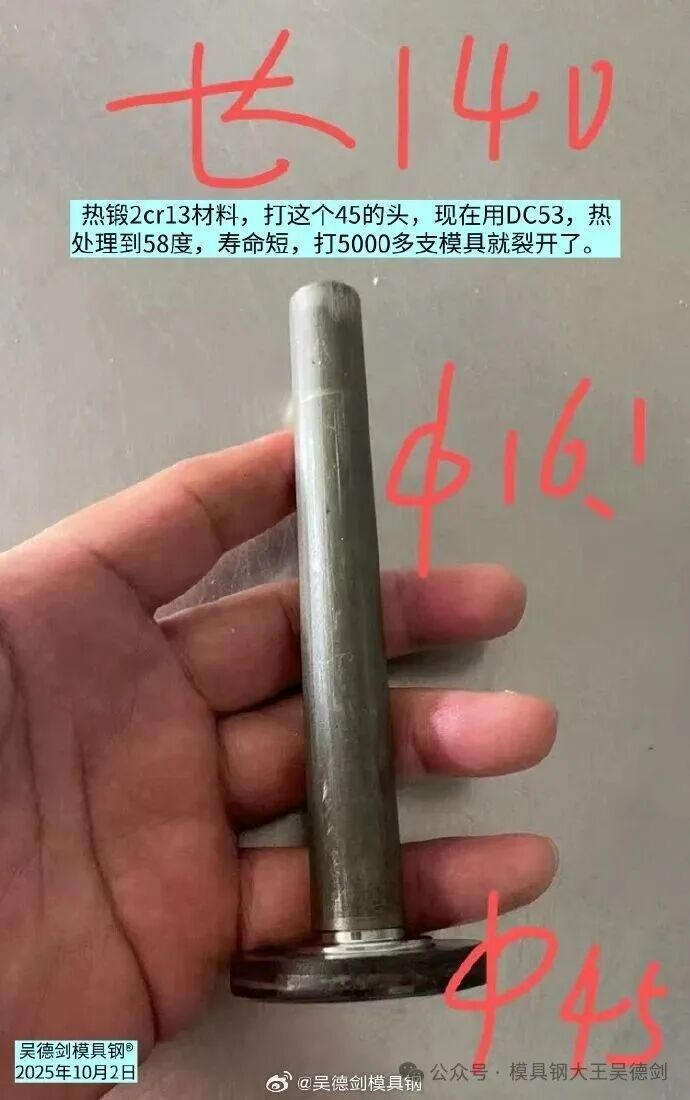 收到網(wǎng)友咨詢問(wèn):熱鍛2Cr13材料,打這個(gè)45的頭,現(xiàn)在用DC53,熱處理到58度,壽命短,打5000多支模具就裂開(kāi)了。
