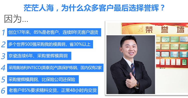 13家塑膠廠,3個出口模具廠,連續(xù)18年采購,8年無客戶退貨。港資模具企業(yè)從2002年開始購買,譽輝2738H模具鋼,連續(xù)采購18年;生產(chǎn)的模具絕大部分外銷。