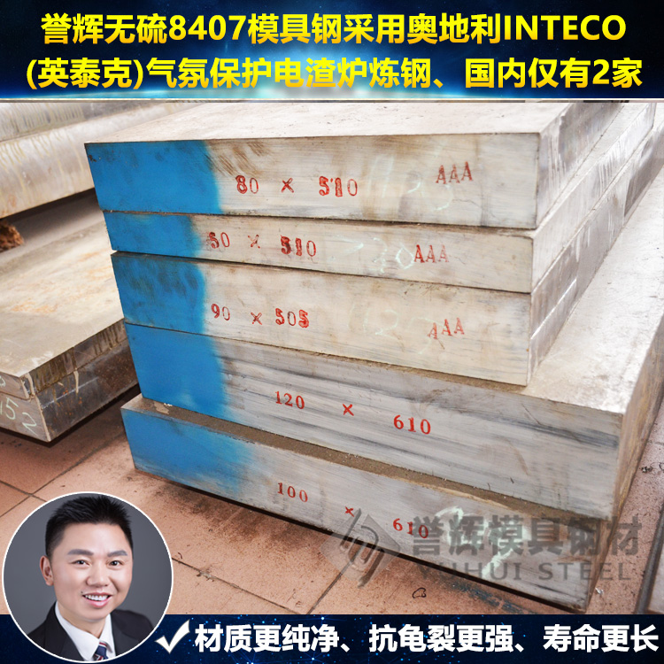 譽輝無硫8407模具鋼,采用奧地利INTECO(英泰克)氣氛保護電渣爐煉鋼,國內僅有2家。鋼中有害雜質硫S含量低至0.0005%,國內也許沒有第二家。譽輝無硫8407模具鋼壽命是同行2倍。
