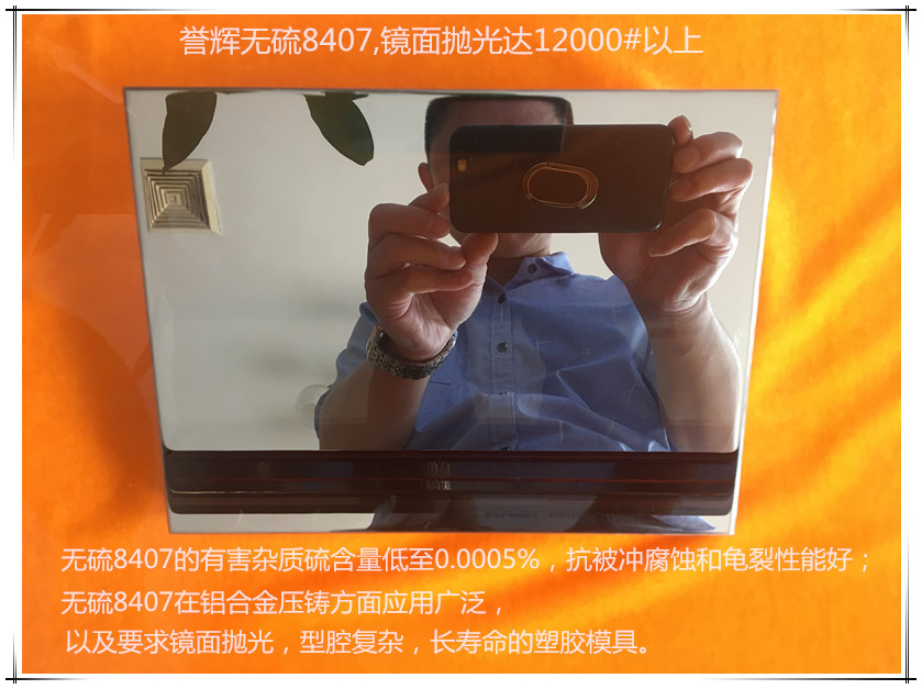反映模具鋼純凈度的技術指標是硫含量值。進口模具鋼材的鋼中硫含量是0.001%;同行模具鋼材的鋼中硫含量是0.03%;無硫8407模具鋼的硫含量是0.0005%(接近無硫級)。硫含量高低代表模具鋼的純凈度級別;硫在熱作模具鋼中會導致模具龜裂,或開裂報廢。(純凈度好的模具鋼,都是可以鏡面拋光的。下圖是無硫8407鏡面拋光效果相片。)