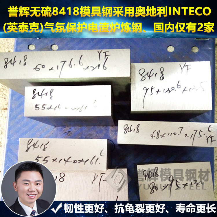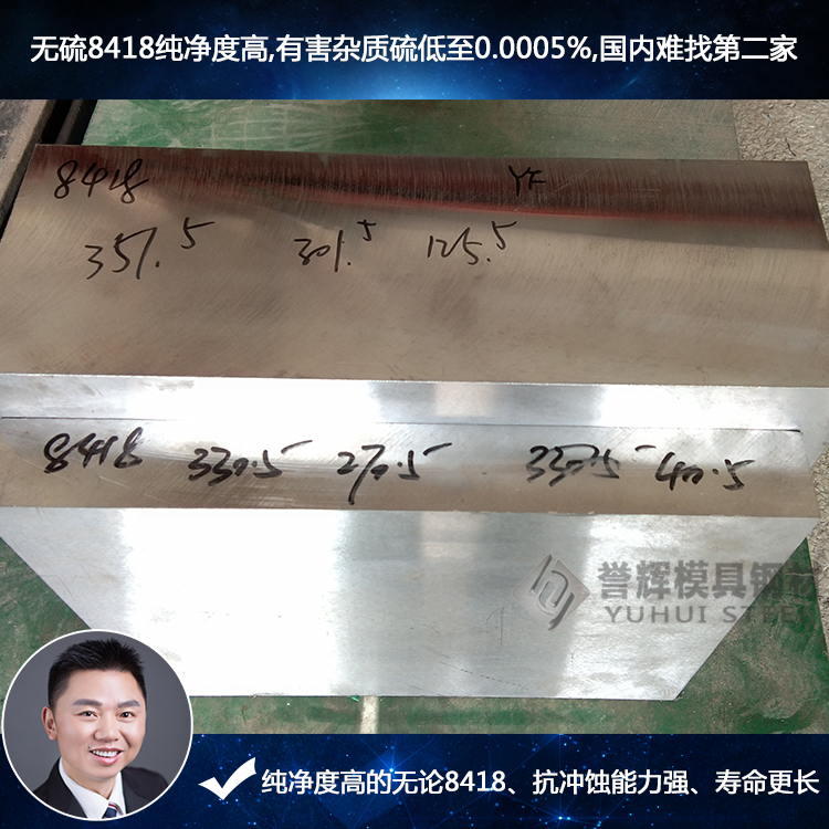 譽輝無硫8418模具鋼,采用進口奧地利INTECO(英泰克)氣氛保護電渣爐煉鋼,國內僅有2家。生產的無硫8418模具鋼純凈高,有害雜質硫S含量低至0.0005%(達到無硫級),國內也許沒有第二家。無硫8418模具壽命和洋品牌一樣,售價低30%。