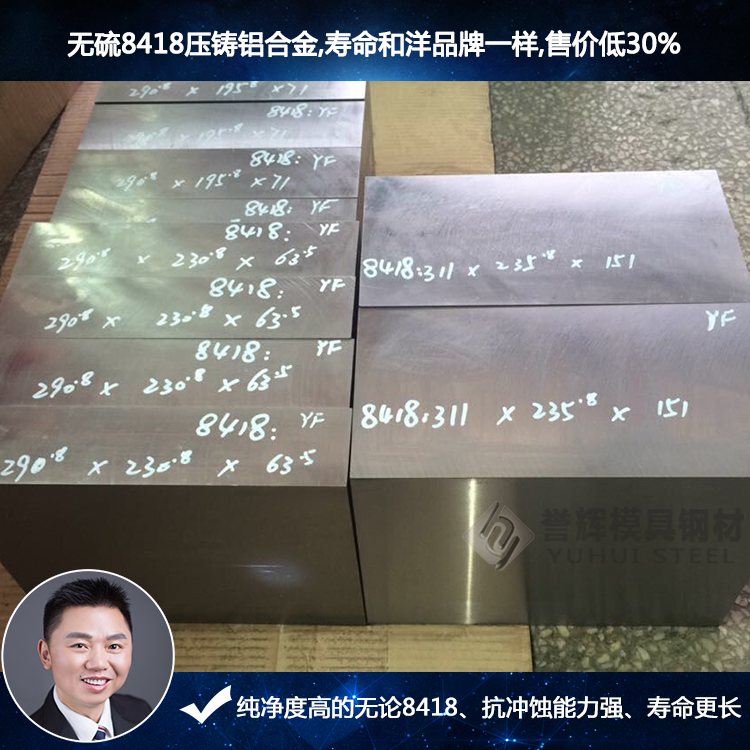 無硫8418在鋁合金壓鑄方面,模具壽命與洋品牌一樣,售價比洋品牌低30%。與無硫8418同級別的材料有8418、W 403、DAC-M、DH31-EX、EX1、EX2。以上這些材料售價都在130-180元每公斤。無硫8418模具鋼價格,與國產普通材料相比是高一點, 但模具壽命多30%,分攤到每個零件的費用卻更低。還減少了修模頻次,提高生產效率。無硫8418價格低洋品牌30%。