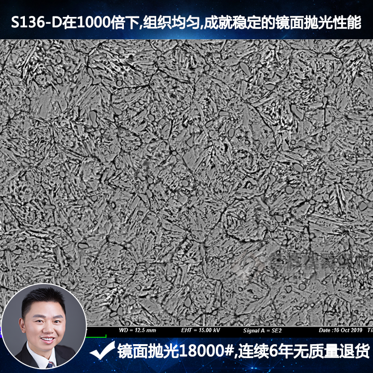 深圳高校搞金屬材料研究的阿東說:在1000倍的掃描電鏡下,看熱處理后的S136-D材料,初步分析是馬氏體+球狀碳化物+殘余奧氏體。如果單看組織來分析性能的話,S136-D的性能已經(jīng)是非常好的了。產(chǎn)品就怕扒光了看,美不美,立馬區(qū)分出來。還有世界500強(qiáng),廣州捷普電子,也在持續(xù)采購,譽(yù)輝S136-D模具鋼。